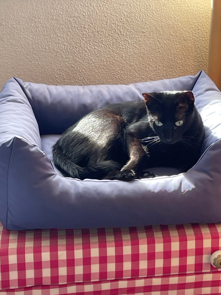 Edellisissä kuvissa tosin tilanne on päinvastoin. Hannes pedissään nauttii auringon lämmöstä ihan hereillä ja Monami nukkuu meidän sängyssä.